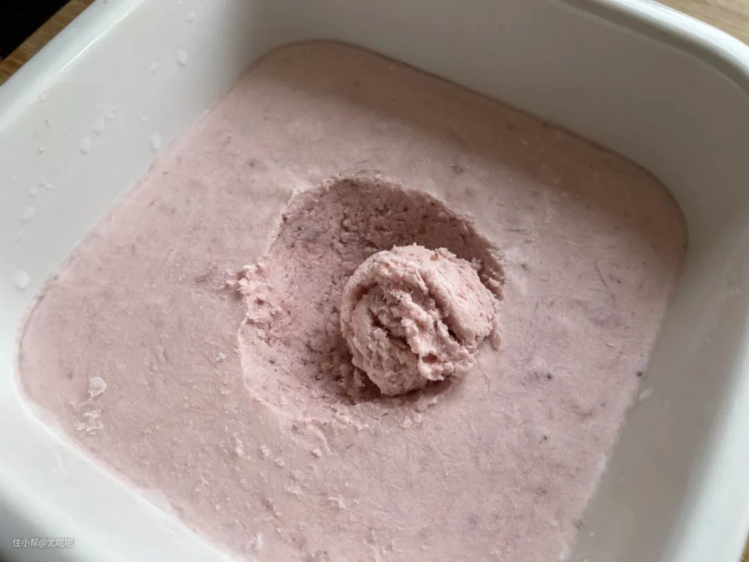 软化过的冰激凌很轻松就能用勺子舀起来,甚至团成一个小冰激凌球也是没问题的。