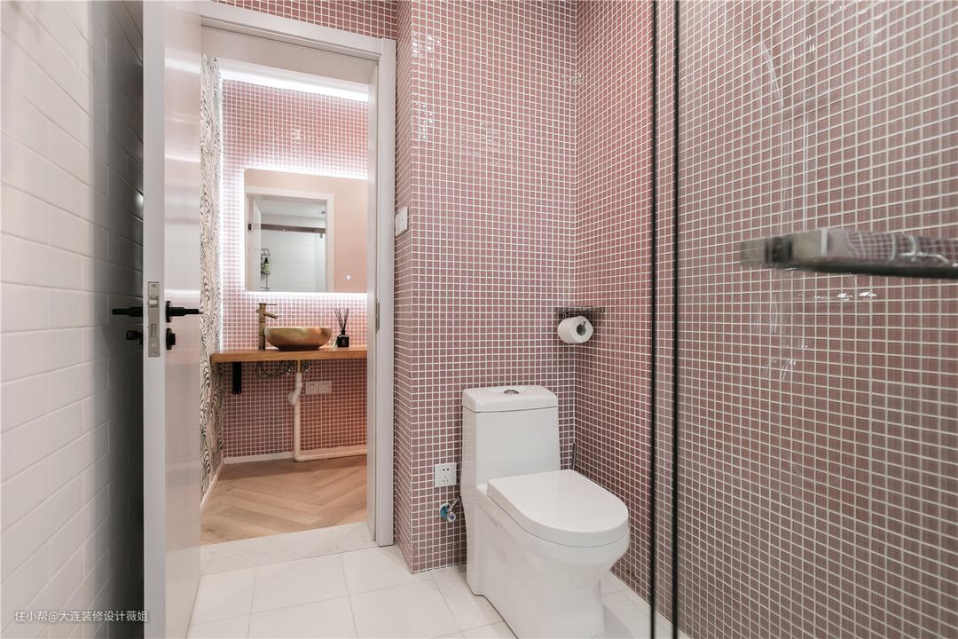 #卫生间 #卫生间的墙体以白色瓷砖搭配粉色马赛克,提亮了色调,精致且浪漫。