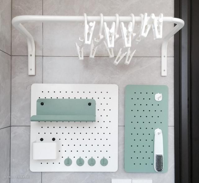 也可以在侧边墙安装这种带夹子的挂杆,不需要晾衣架,洗干净的衣服直接夹起来晾晒。
