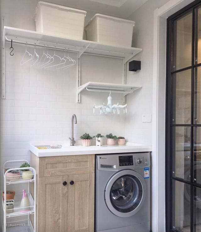 阳台装一个洗衣机柜,洗衣池可以用来洗衣服,柜子用来收纳洗衣用品、洗衣工具等,然后在洗衣机上方安装两根挂杆。下面伸手就能够得着的挂杆用来晾晒衣物,高处的挂杆用来晾晒大件物品,比如窗帘、床单、被罩等。