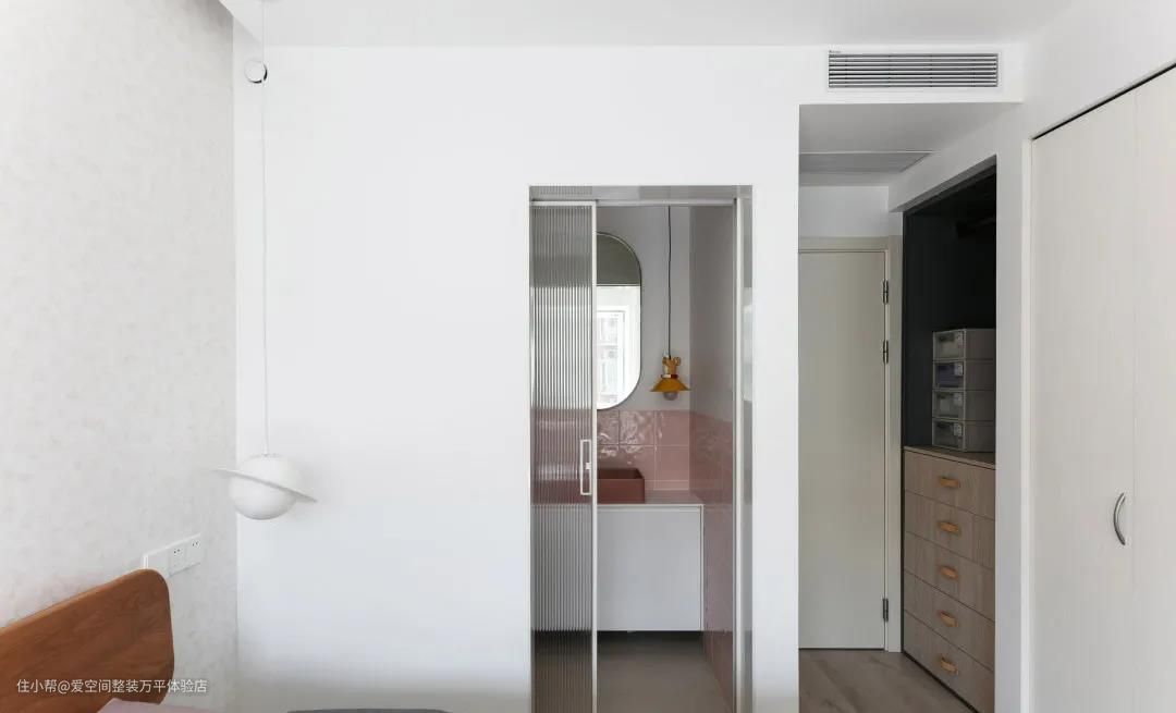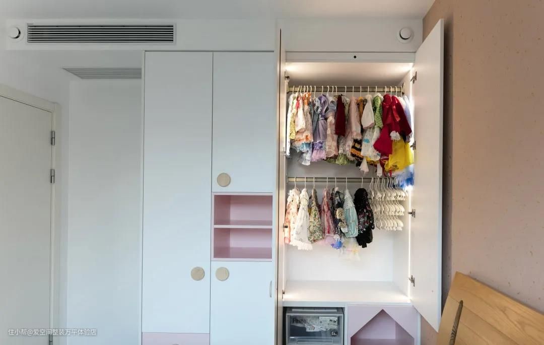 女儿房也用了她喜欢的粉色小调,尤其是衣柜做了壁龛敞开柜,十分新奇有趣。开放格可以放置小摆件,或者故事书。