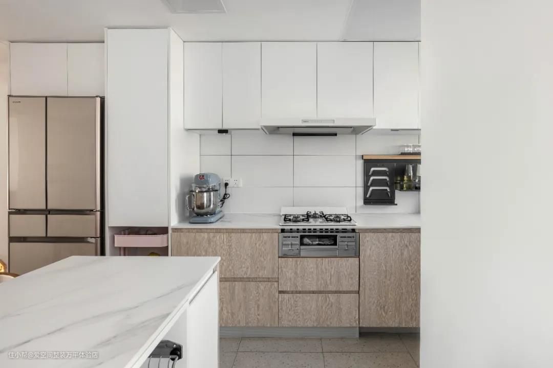 把原来的封闭式厨房打开后,做了中西厨分离设计,满足多种烹饪需求。