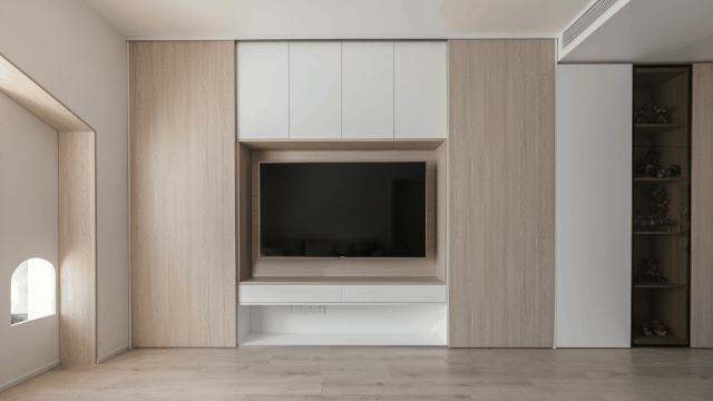 客厅是心目中素净整洁的模样,定制的全墙式电视墙柜省去了挑选和搭配电视柜、电视背景墙的烦恼,也节省了许多预算。
