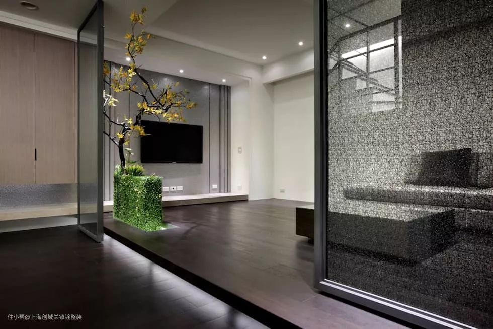 视听室也是地下室的入口玄关,铁件滑门搭配布置变化了空间层次感以及趣味性