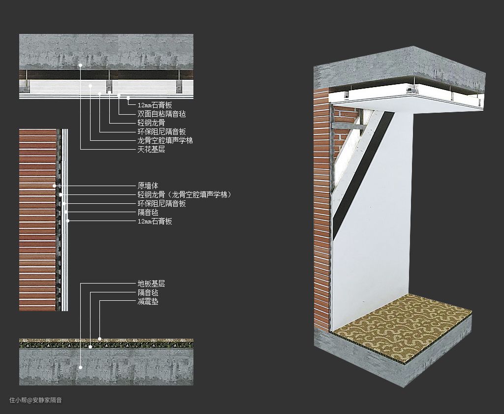 除了声音类噪音防治方案、震动类噪音防治方案,还有更专业的(最厚的),受限于住宅的层高和面积,家装选择此隔音方案的较少。隔音施工具体操作流程请点击: