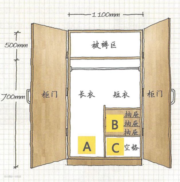 内部层板、抽屉可以说是非常常见的衣柜设计,但在实际使用过程中,反而出现各种不便的问题。例如A悬挂区下部空间浪费,B抽屉太浅装不了什么衣服,C底部空格不合理、难利用。