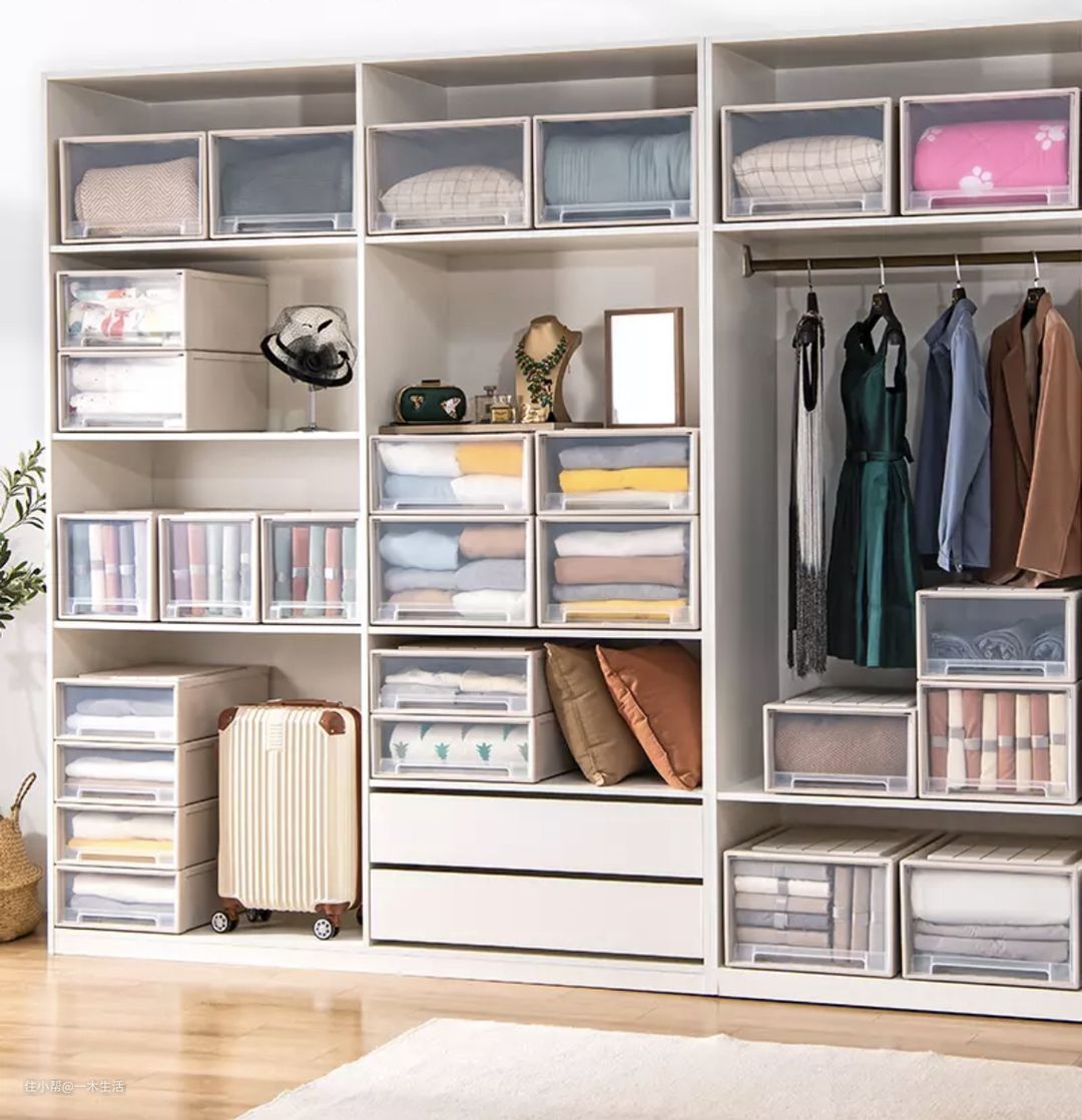 说到收纳神器,一木生活先安利一款塑料抽屉!前面也说到,衣柜自带的抽屉内层太浅,实在装不了什么衣物,但衣柜还是要讲究归类收纳,才能保证高效收纳。