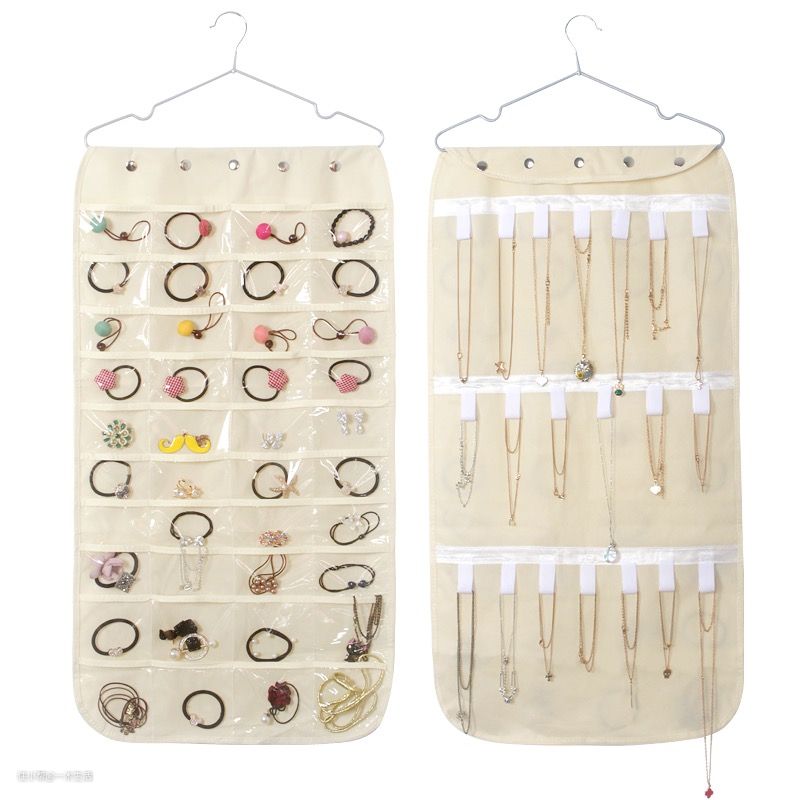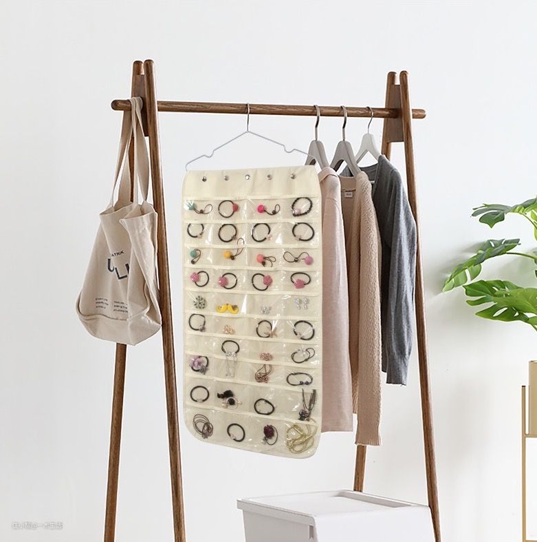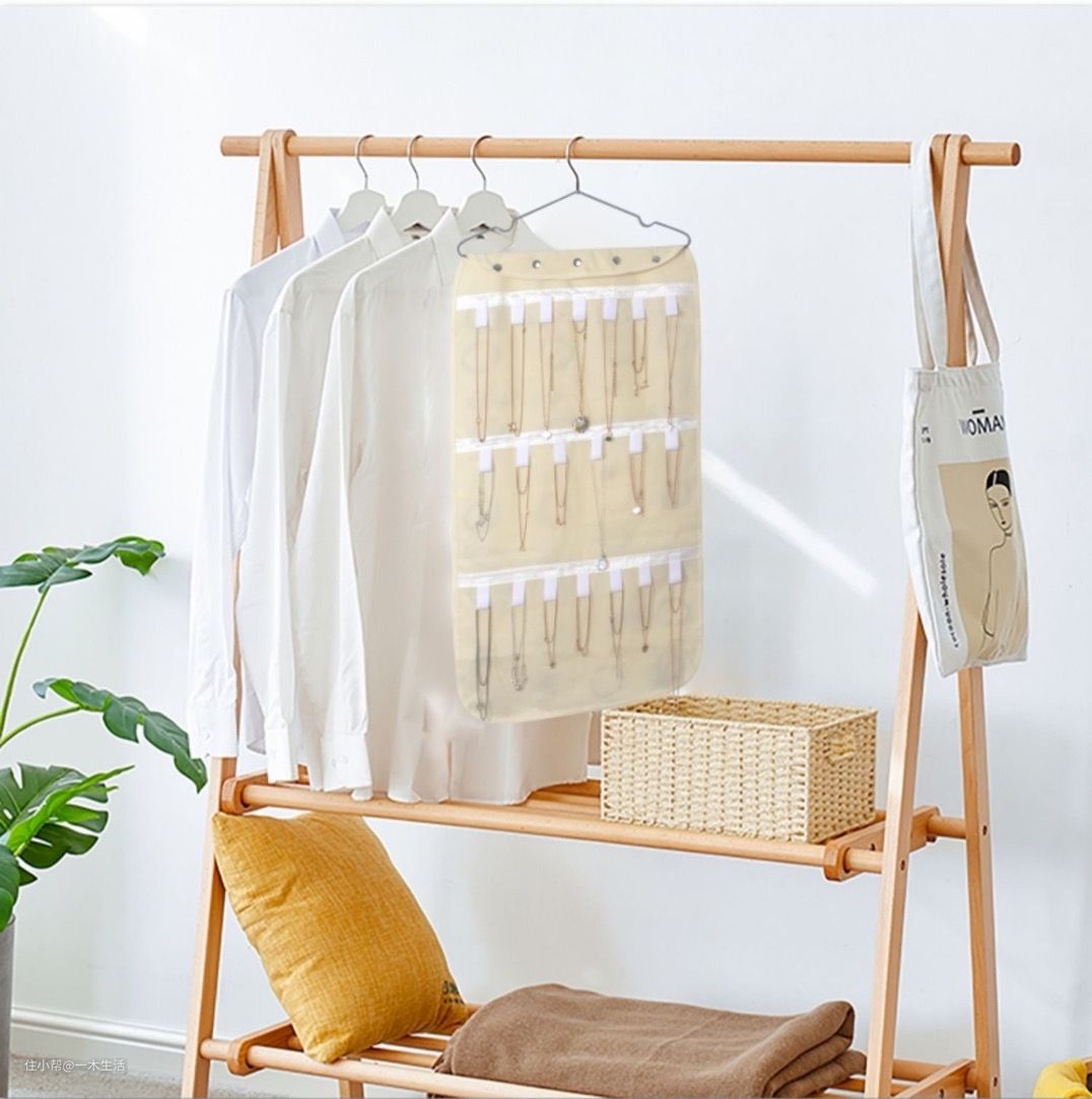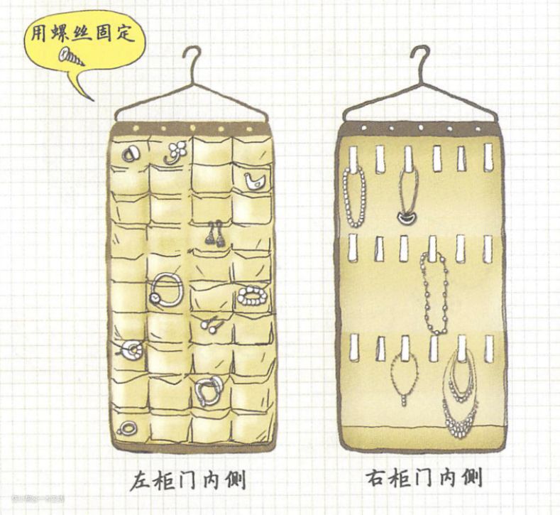 针对于饰品较多、家里又没有多余空间置放首饰盒、首饰柜的朋友,还可以选择在衣柜门的内侧装上收纳挂袋,专门收纳胸针、钉扣、戒指、项链、手表等等,避免饰品堆放在一起时各种打结、还难找!