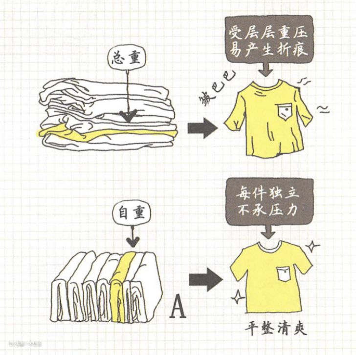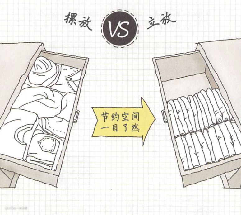 此外,还可以通过用“立叠立放”的方式对衣物进行折叠、收纳,不仅能避免衣服折皱,还能节约空间、使衣物存放规范、一目了然。