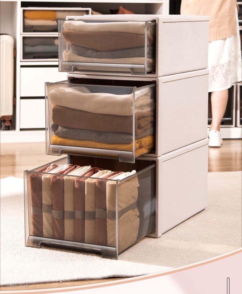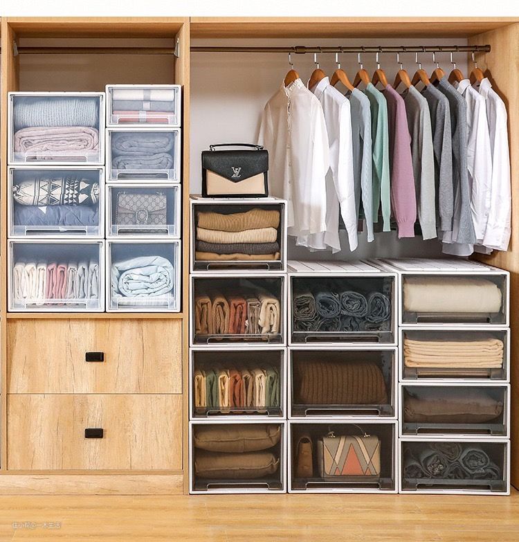 所以,在衣柜内叠放几个塑料抽屉,对不同的衣服进行分类存放,实现收纳空间的系统化。加上这类抽屉拉推、移动方便,也能提升我们取放衣物的便捷性。