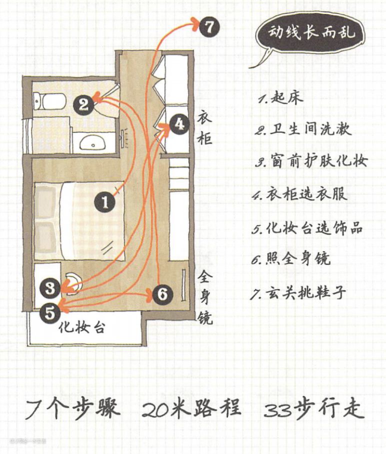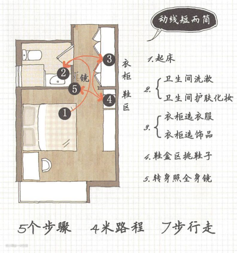 但通过挪动部分物品的位置,即1.梳妆台搬动至卫生间;2.全身镜放置于衣柜对面;3.鞋子从玄关转移到主卧。这三处调整,使动线清晰、流程化,路线缩减为5个步骤,路程减至4米、行走减至7步,小小的挪动,真能少费很多劲。