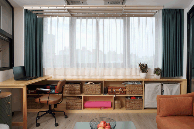 · 沿着收纳柜上方定制了一条凹槽轨道,书桌因此实现了可移动。一个人看书工作,两个人喝茶聊天,生活从来都是可咸可甜的。