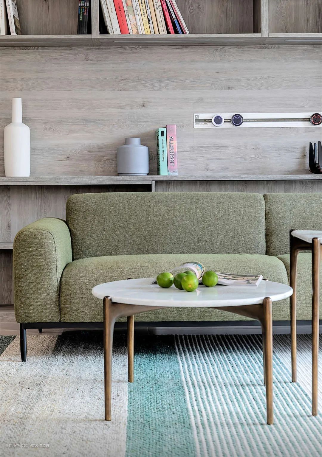 浅灰木色的壁柜颇有文艺风,搭配浅绿色清新布艺沙发,以及同样清新绿色条纹地毯,整个空间的文艺感爆棚。