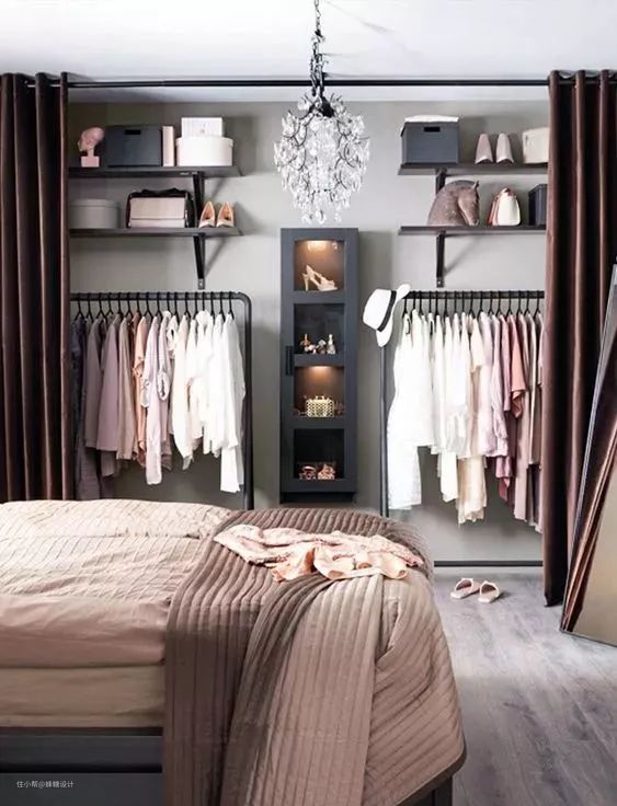 不知道有没有人和小编一样,挑衣服穿时喜欢把衣柜门都打开,这样挑选起来比较方便,衣柜里有什么全部收入眼里。那么比起柜门装个帘布再合适不过了,一拉一合,不用一个个开柜子。在空间感上也放松了许多,只要确定好外框的位子,柜体里则任由你发挥摆放,省时省力省空间~