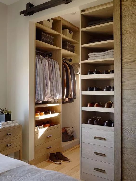 当然啦,一般的房子要整出个衣帽间还是有点困难的。如果卧室空间还算OK的,可以考虑把柜子的空间做大,做成个小步入式的,也算是小小满足衣帽间的梦想哦~