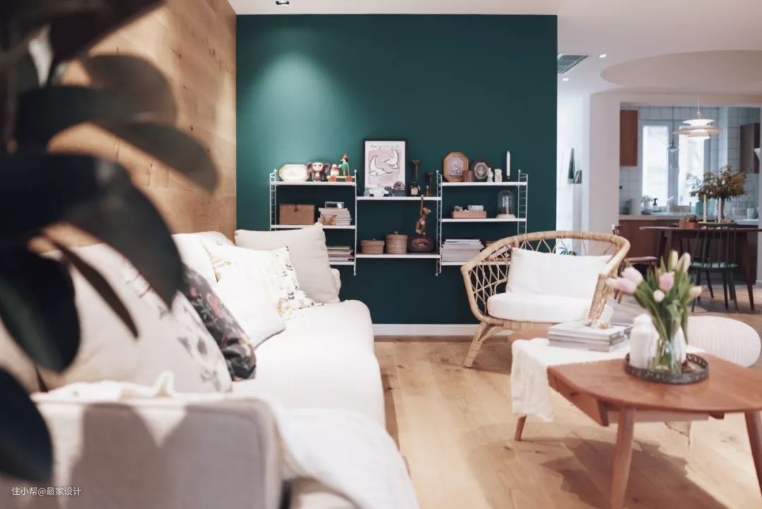 同一户型的很多业主,希望将图中绿色墙体敲掉,形成通透的大空间。设计师将这面墙涂刷成跳跃的颜色,墙面安装置物架,美观实用,还杜绝了安全隐患,并且起到了小隔断的作用。