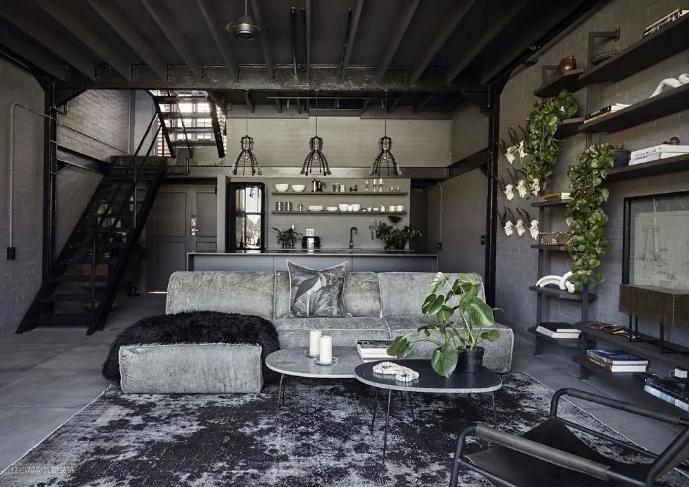 要进一步营造出工业风的感觉,混凝土、砖墙和四处延伸的金属管道是很好的作料。如果不想要木制品和白色,那就试试毛绒织物和绿植,它们能更好地融入环境,并能同时带来温暖与活力。