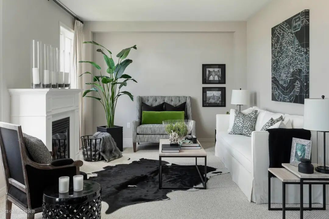 银白色墙面与蒸汽灰的粗织地毯构成了一个明亮简雅的空间,对比强烈的黑白让空间更显时尚。黑色通过不同的形状、材质、纹理让空间变得丰富。双人沙发上树梢绿的天鹅绒长条靠枕与傍边的大叶绿植,茶几上的植物摆件相呼应,而又层次丰富,为空间点缀了恰到好处的绿意。