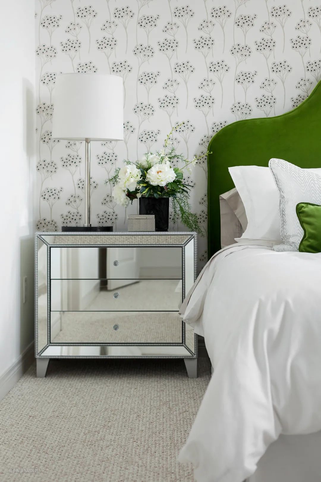 这是间素雅明亮的卧室,百合白的墙壁、蒸汽灰的编织地毯、亮白色的床品,质感多变富有层次。树梢绿的天鹅绒床头板与靠枕搭配花卉图案墙纸,营造出了自然轻盈的森林气息。魅影黑的复古单椅拥有优雅的曲线与精美的雕刻,丰富了空间功能的同时还有很好的装饰作用。