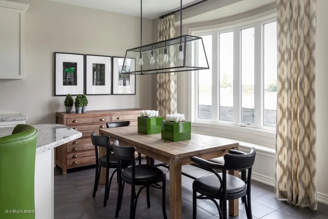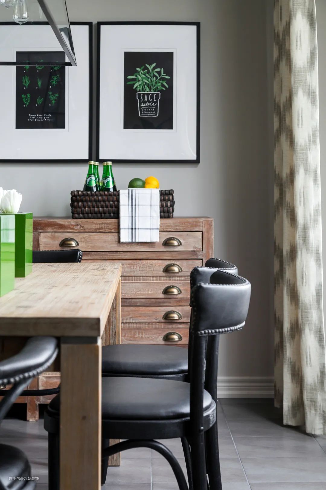 案例中的餐区墙壁用银白色粉刷,与晚霞色的轻质窗帘搭配和谐而富有层次,窗帘上的灰色图案又与地面钢灰色的地砖相呼应,整个空间极具凝聚力。黑色皮质餐椅丰富了空间质感,与灯具及画框的黑色线条相配,让空间更有棱角。木质餐桌搭配树梢绿的方形花瓶,大自然的气息扑面而来。
