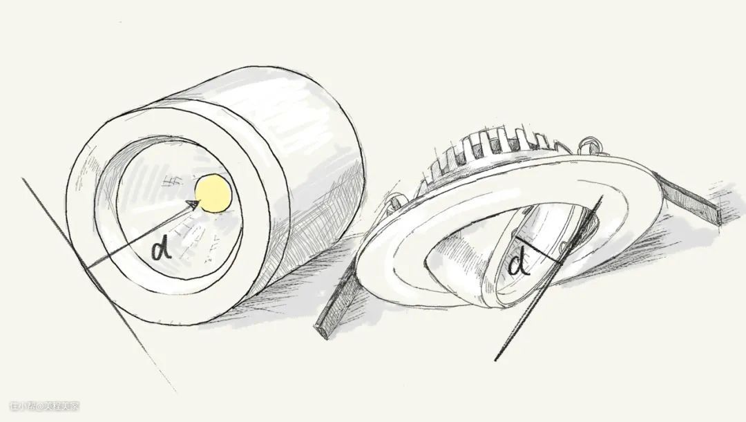 遮光角低于30°的灯具,会对人眼产生大的辉度,眩光刺眼。有一种简易方法人眼辨识遮光角 :产品图片或够吗实物看一下,灯口平面到光源的深度d和拇指长度相似,遮光⻆就会在45度左右。