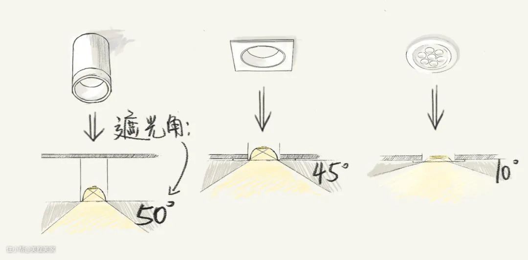 选用“遮光角” 在45°左右的灯源