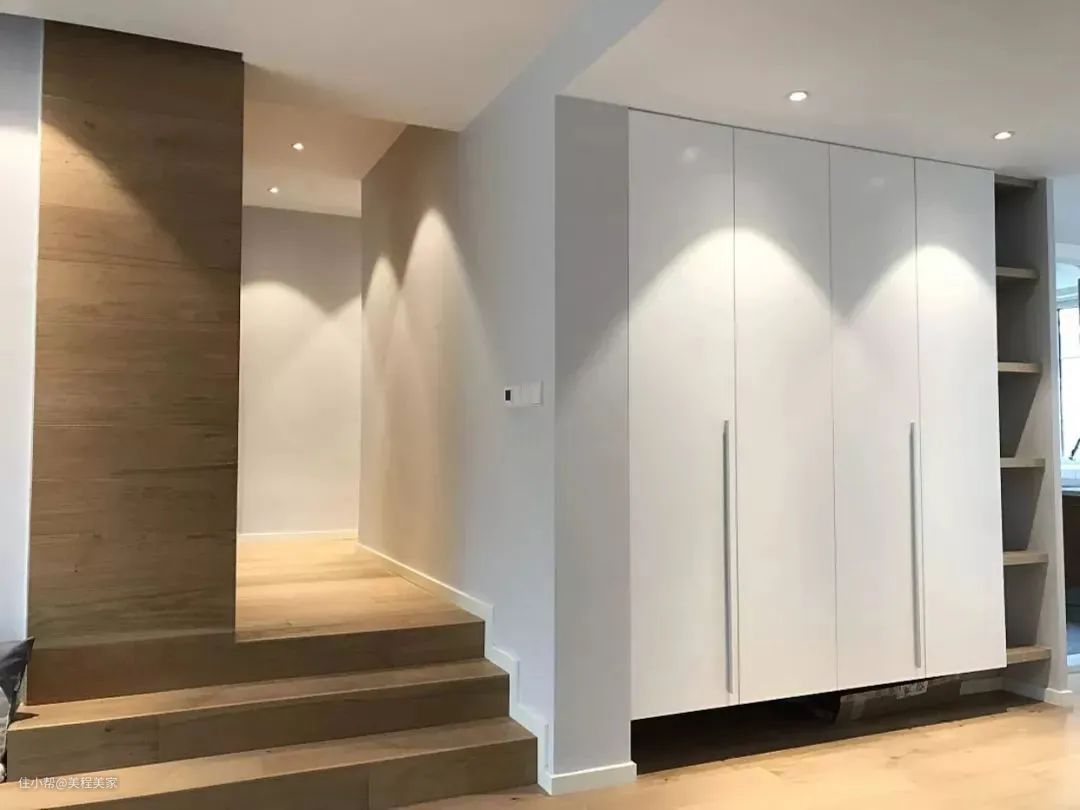 家庭装修中的轨道灯、射灯不需要直接照射,可以调整为斜角度照射墙壁,这样经过墙壁反射到人眼以后,不仅柔和舒适,还具备氛围感。
