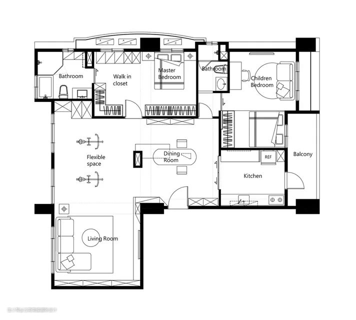 除了色调,原格局亦经重新调整成全开放的室内分配。我们以「回游动线」增添错综的层次和趣味,将原建筑的结构柱从阻隔视感的角色, 转化成划分空间机能定义的主要构线,包含客、餐厅,以及弹性使用的活动场域。