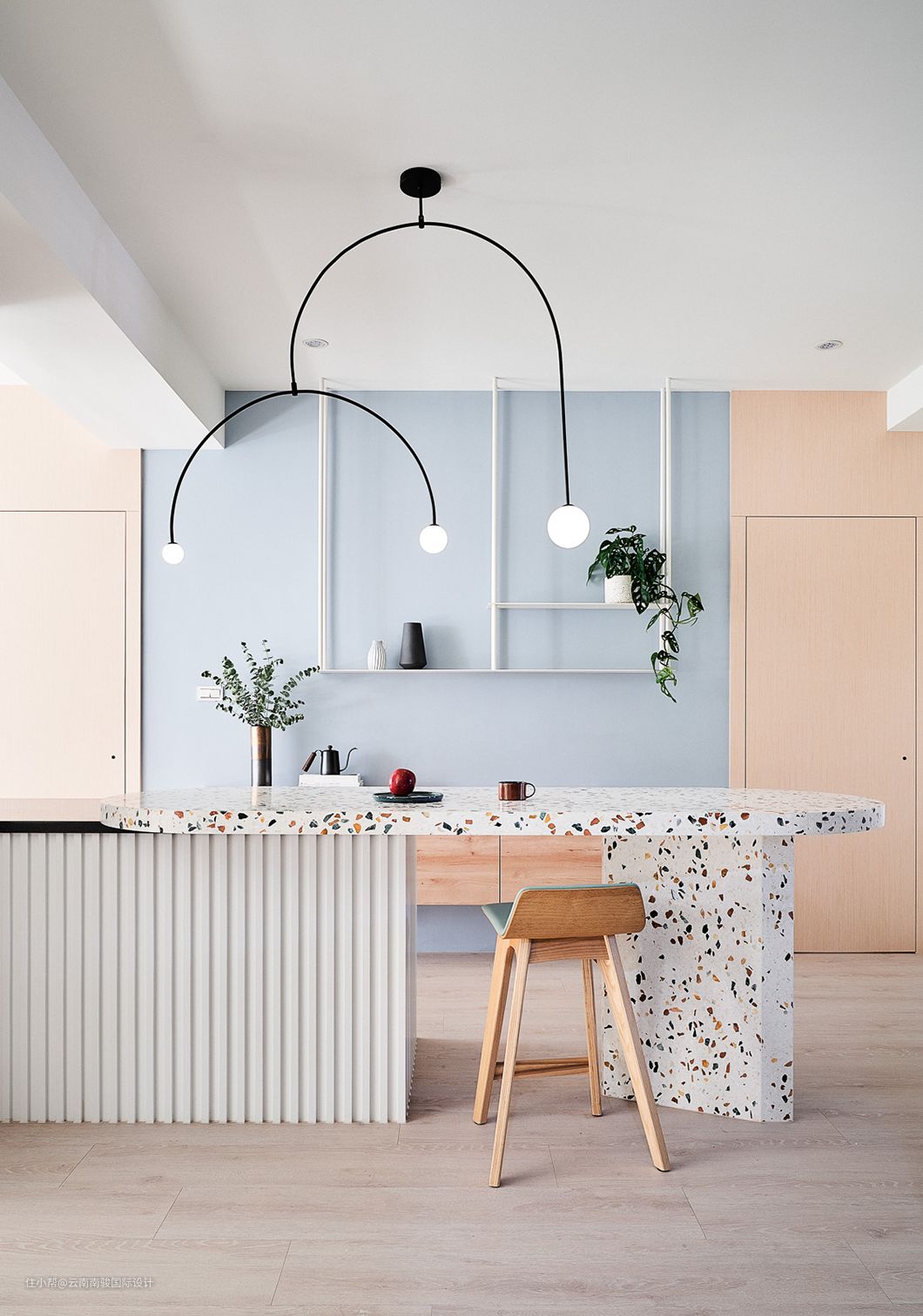 四周置放着比例错落的柜体和悬空的铁件层架,而主体为水磨石的中岛,将表面削砌成圆弧状,并用篓空单脚支撑的工法呈现, 产生别于石材沉重的印象,辅以气泡状的球体吊灯,形塑静谧调性。