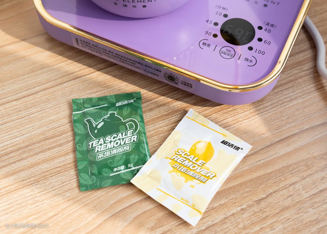 都知道长期煮水、煮茶,壶体会产生一定的水垢、茶垢,用普通刷碗布很难清理掉,这里厂家还赠送两小袋清除剂可使用。