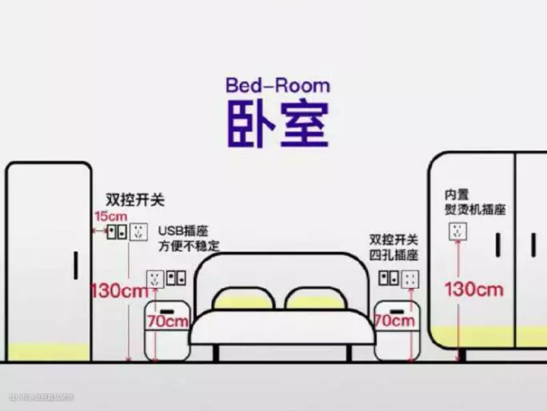 ①客厅照明灯应该分别在进户门前和卧室门前装双控开关; ②卧室照明灯应在卧室进门和床头安装双控开关。床头双控开关及插座在床头柜上面安装,距地600-750mm 。 ③空调挂机插座距地1800-2000mm。安装16A三孔插座。 ④床头壁灯安装高度 ,建议安装高度1500-1700mm。 ⑤电脑桌和其它桌上面的插座距地900mm。 ⑥老人房可预设呼叫器系统。