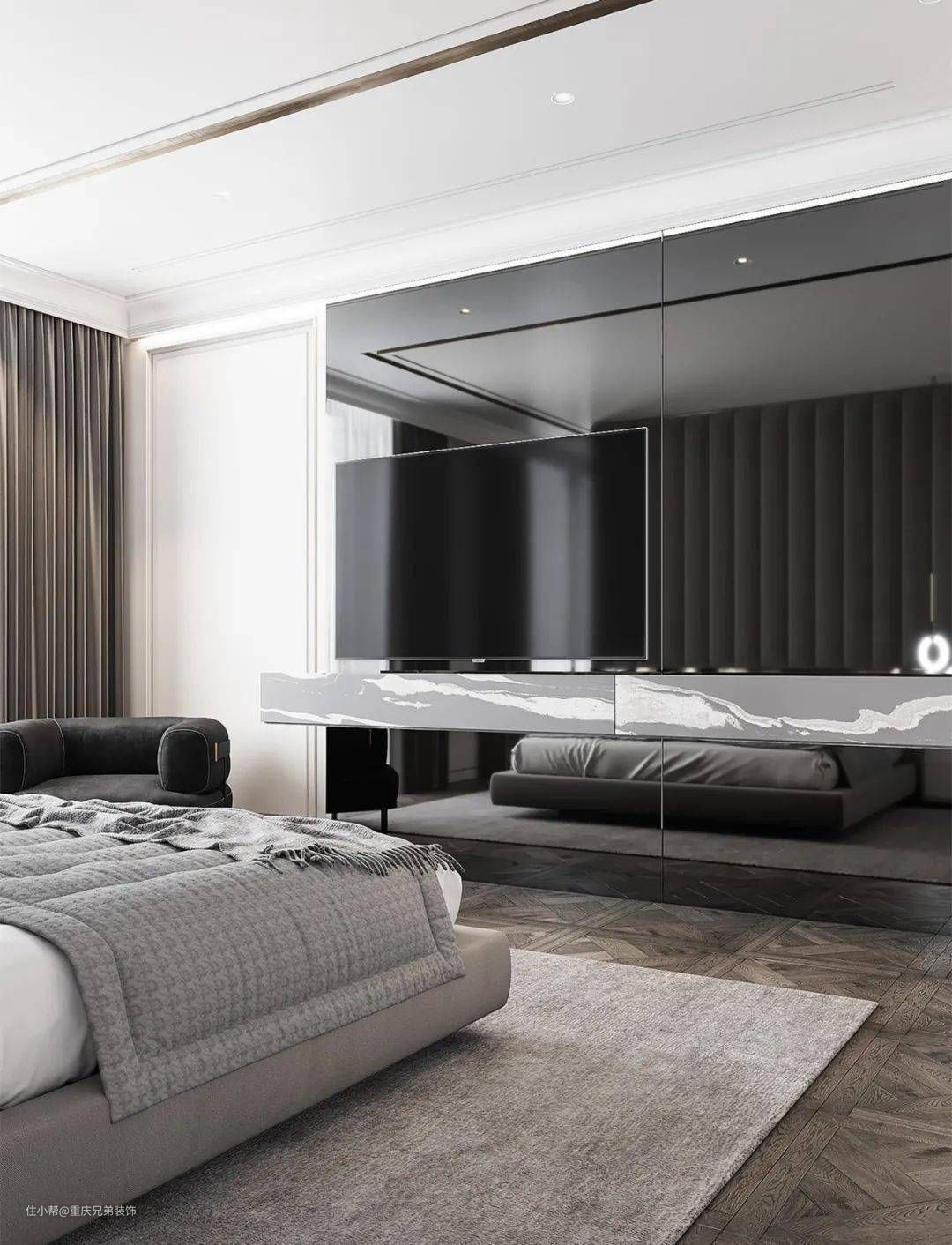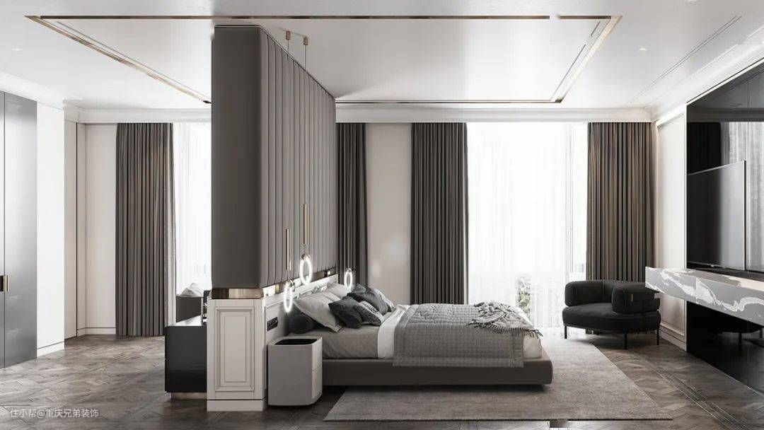 主卧整体风格延续公共空间的元素,凸显主人统一的品味,在这之中融入更多温馨的元素增加木饰面的使用,搭配细致纹路的皮革。