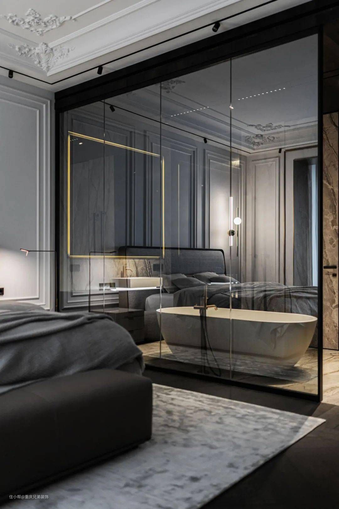 开放的主卧将卫生间包容其中,开放的卫生间区域为整个卧室休息区营造出高级的奢华气质,妥妥的大宅范儿。
