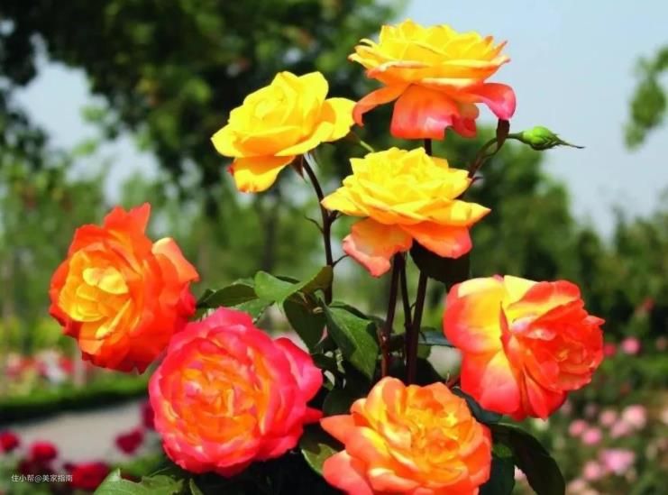 光谱藤本月季,植株能够长到四五米高,再加上它花量大,所以很容易打造成花海和花墙。黄色和橘红色混合花色的它,观赏性很高。如今在很多城市的景观带里,也能够见到藤本月季光谱的影子。