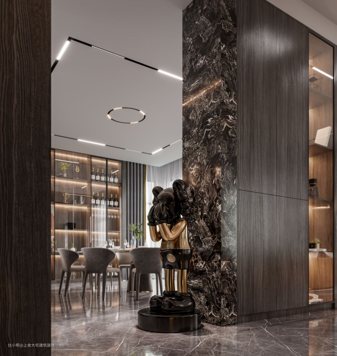 ▼材质温度冷暖搭配得当,半分温暖半分冷静,诠释城市的繁华与自然的回归,材料以天然的大理石为主,适当搭配时尚的玻璃、金属等元素,使得空间更显灵动、自然。