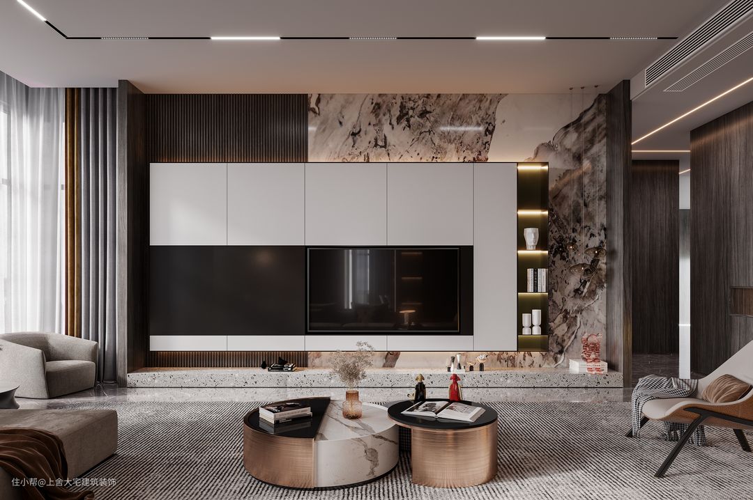 ▼The simulation fireplace under the marble in the living room strengthens the core role of the space and creates a warm atmosphere for the whole family public space. The traditional symbol of fireplace in the modern space also makes the whole space more interesting.
