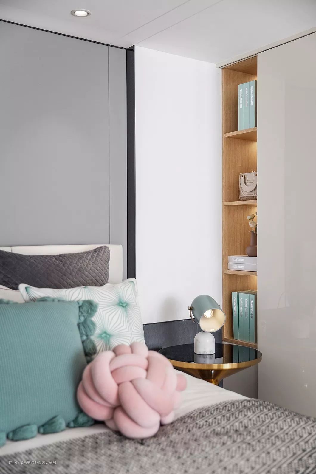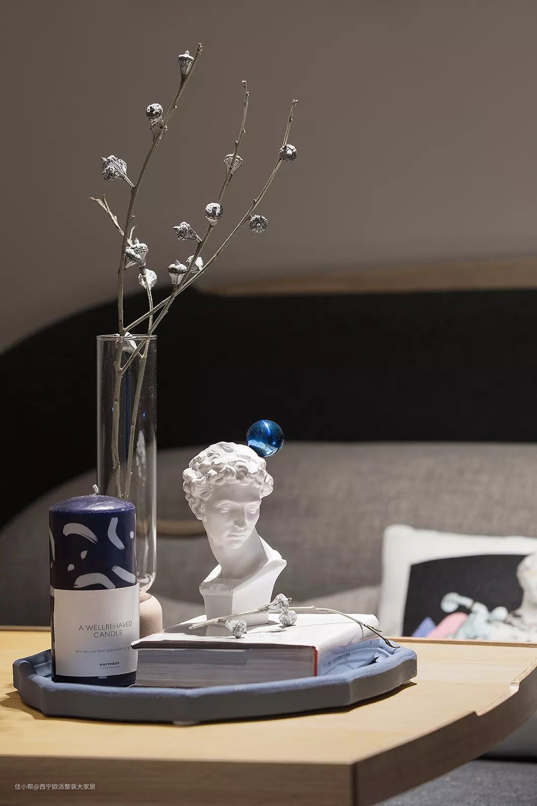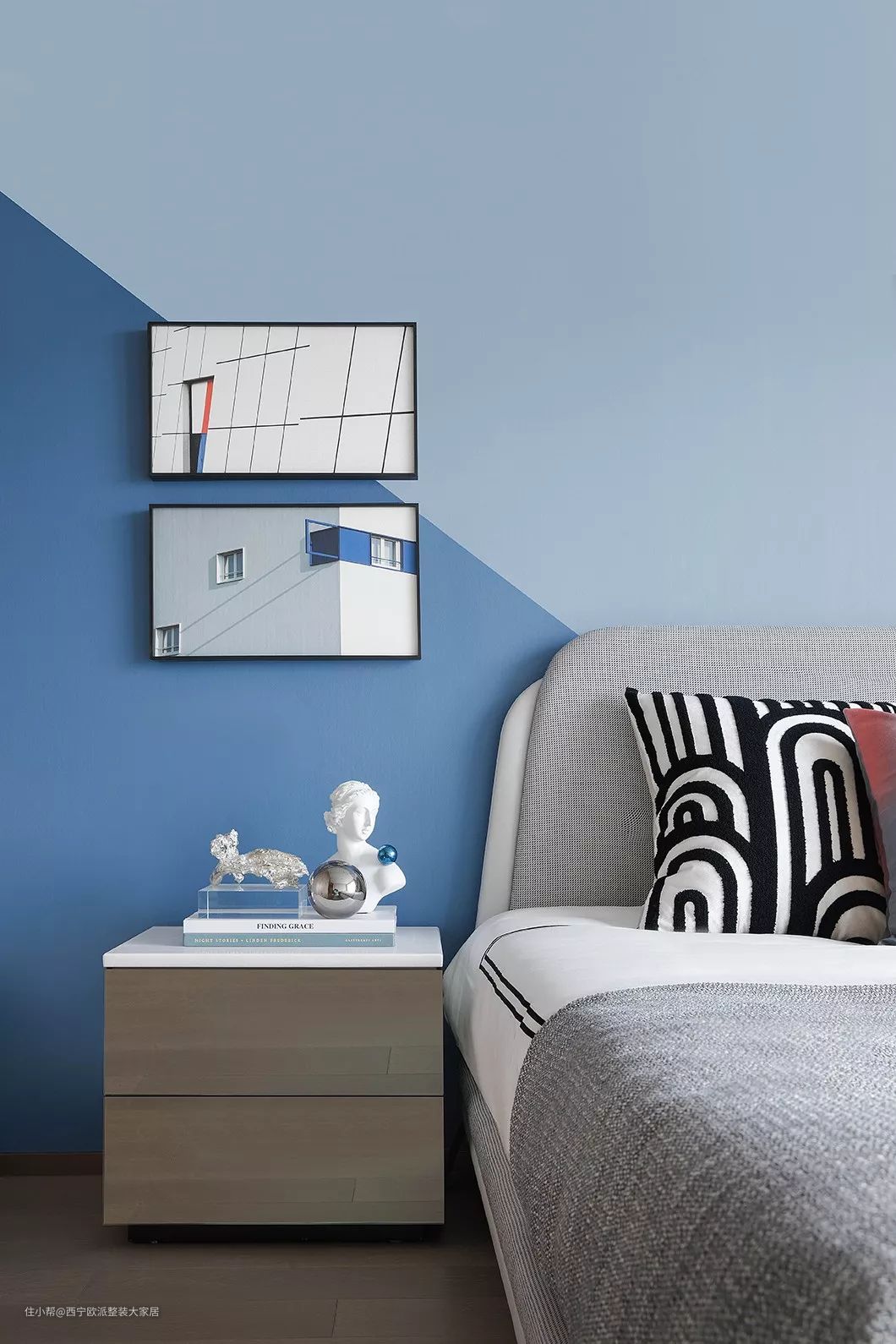 卧室的色调与客厅一致,冷色调的蓝色、灰色为空间主色调,柔软的灰色布艺与背景的几何造型构造出不简单的空间质感,桌面的雕塑诉说着美学的思考.....