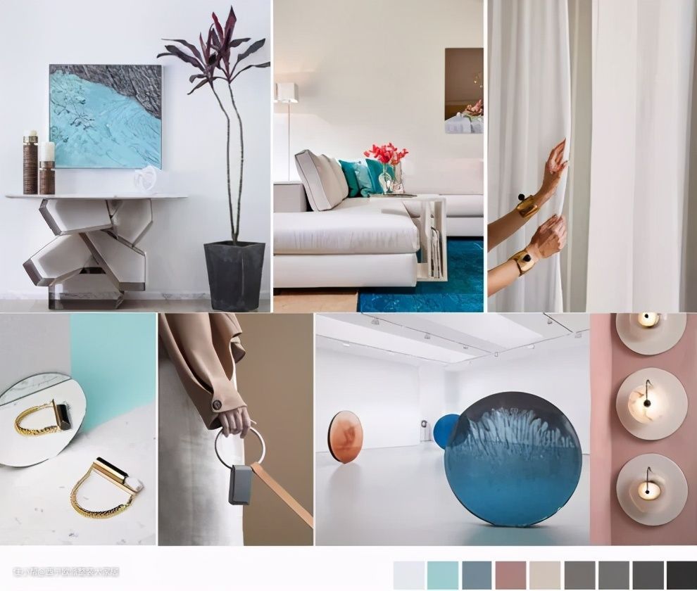 温顺善良的白色瓷器的兔子延续大厅主题,几何形状的色彩交汇赋予空间暖色调的同时时尚感十足,白色、蓝色、金属色的大小不等的球体装置由壁挂延续到餐桌装饰,有弧度的线形灯饰装置,简洁的不规则桌椅,无不透露着人居空间美学态度。正方形的壁画、蓝灰色的布艺沙发与地毯交织出温暖的色调。