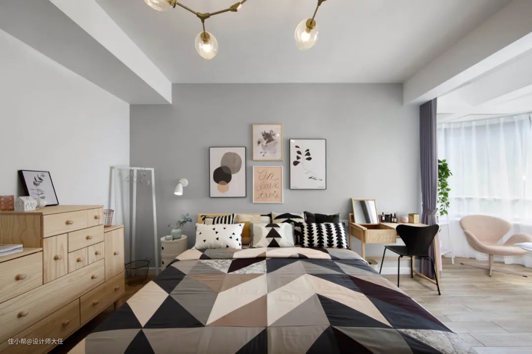 喜欢丰富墙面效果的,可以选择大面积构图的整体画,丰富有趣的墙布图案,也能让卧室显得更加艺术端庄。