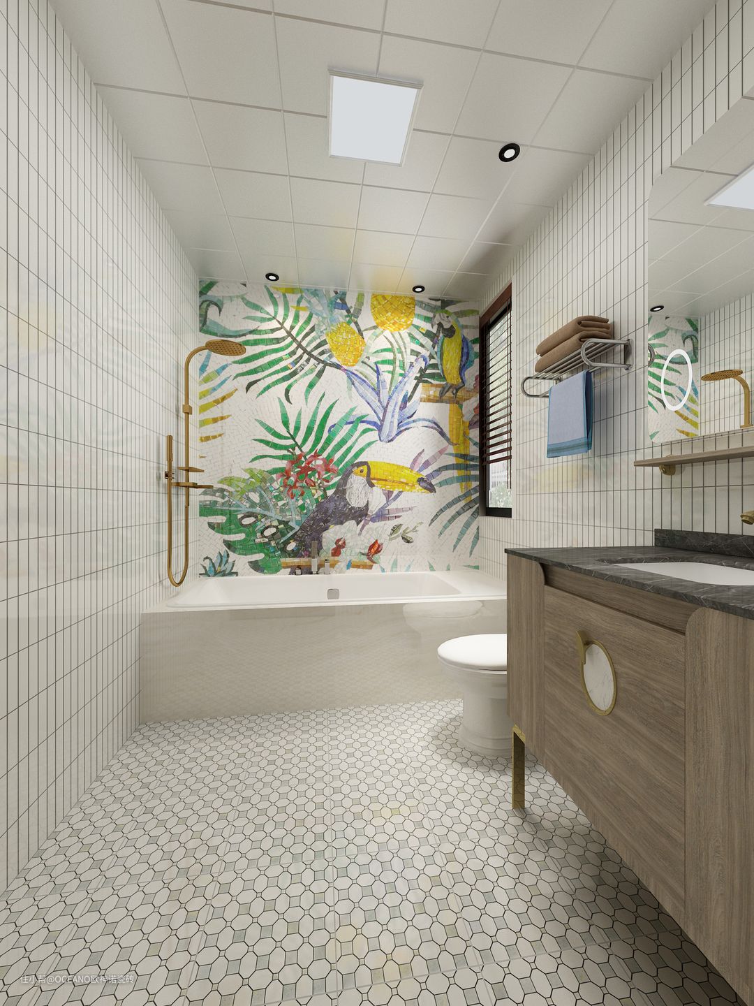 在沉闷的浴室家装中搭配,一款Art-Deco风的马赛克剪画,沿袭洛可可时期教堂的奢华与文艺。