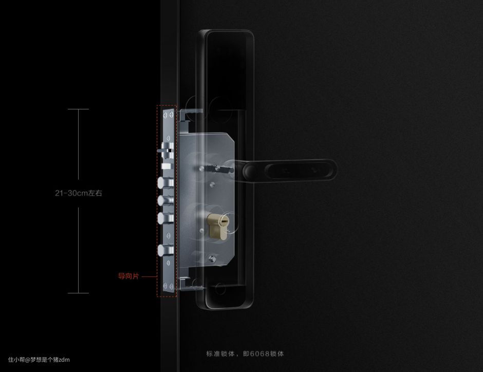我们大部分人家里的门锁一般都是标准锁体,也就是6068锁体,所谓6068锁体,这里的“60”指的是方钢孔到锁体侧边的距离,“68”指的是方钢孔到锁芯中央的距离,6068锁体的门锁导向片长度通常为240mm左右。