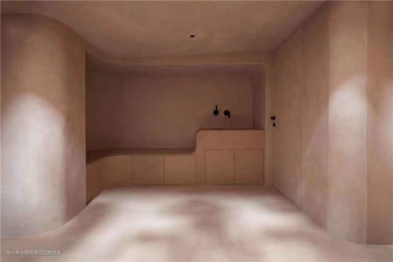 微⽔泥能够做到表⾯⽆接缝。与它的⾃身材质相关,⾃身的可塑性极强,它可以做到墙、顶、地统⼀使⽤,半固态的效果也可以与其他装饰材料完全贴合,使⽤时⽆需考虑接缝问题,能够打造连续、流动、整体化的空间视觉。