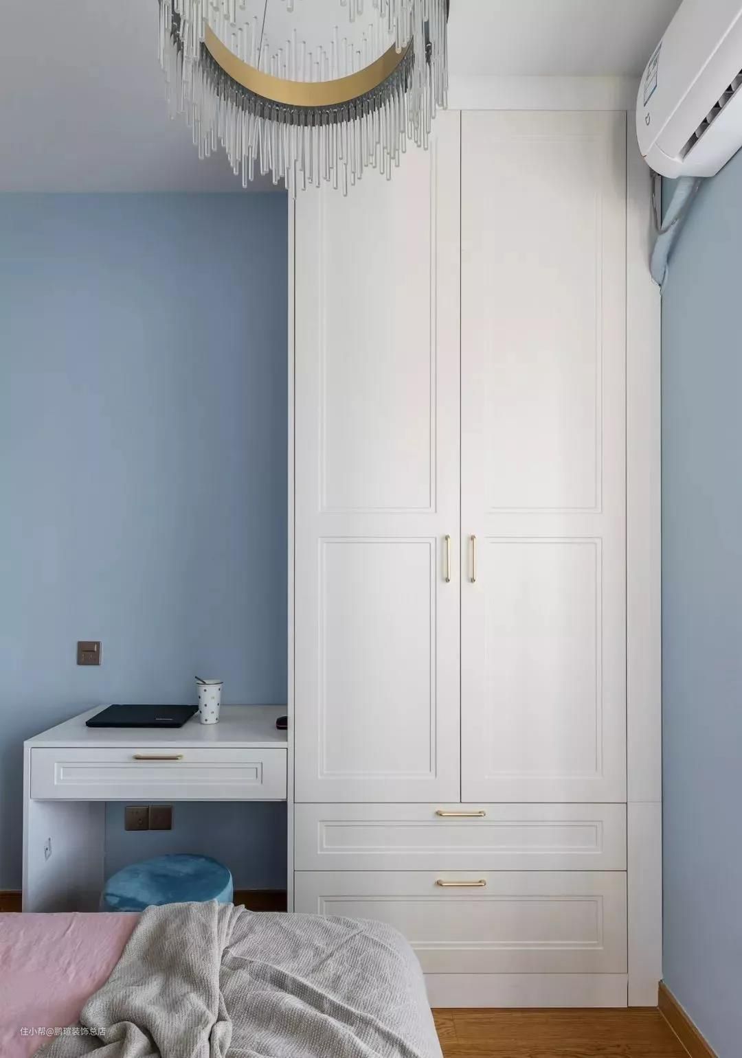 床尾定制了白色顶柜,收纳摆放女儿的衣物,旁边一体打造了小书桌,方便学习使用。