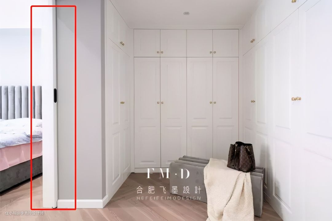 将门体嵌入墙体内部,设计隐藏门,打开弧度大,占面积小。