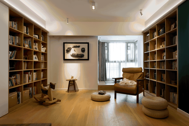 客厅打破了常规的设计,没有长沙发和中央茶几,也没有电视娱乐区,而是沿墙对应打造了两个木质书架,丰富的藏书,就像图书馆一角,充斥着文化气息,让人内心感到充实。