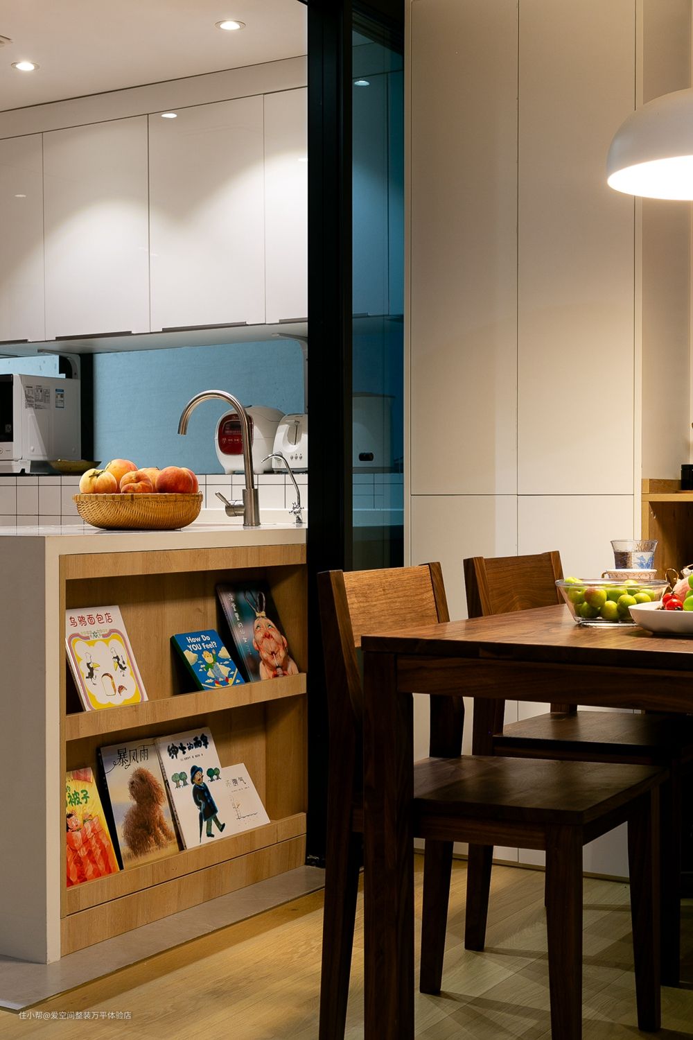 岛台靠餐厅一侧巧妙地设计了内嵌双层简易展架,摆放宝宝的画册读物,高度适合,易于拿取。