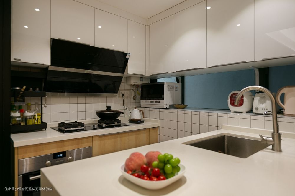 区域不大,却巧妙利用橱柜、吊柜、窗台和岛台,将空间合理利用到极致,没有丝毫零乱,设计手法相当高明。