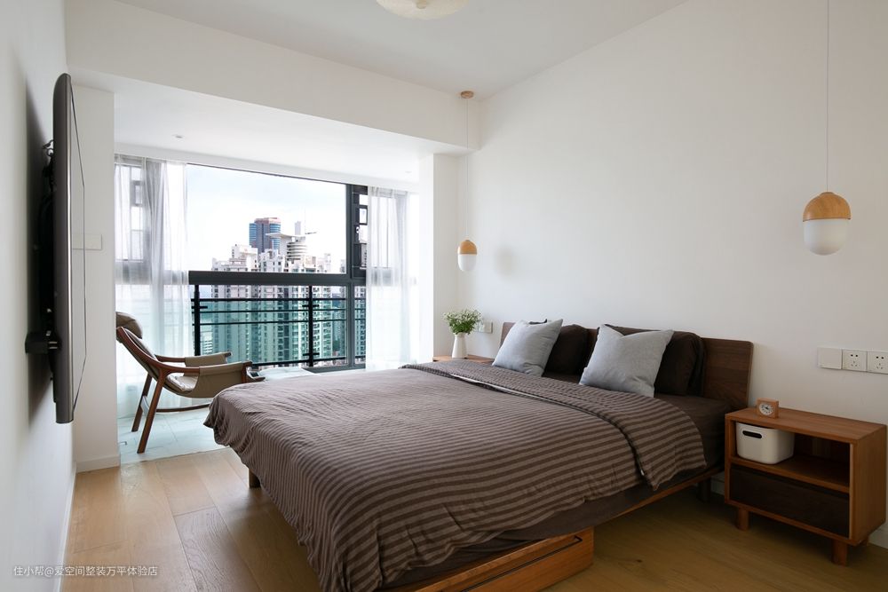 主卧的设计相当简约,将阳台纳入了室内,空间变大了,感觉更开阔,原木地板呼应整体风格。