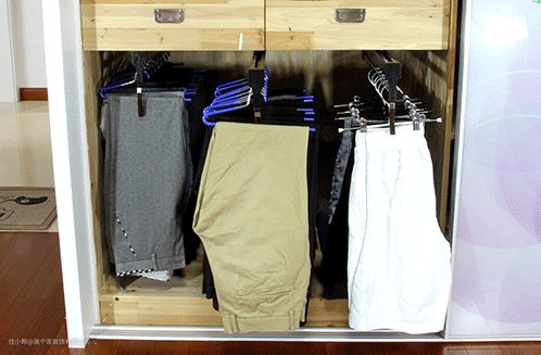 纵向抽拉式的裤架,再搭配Z形状的晾衣架,比起叠放衣物,不仅收纳能力更强,而且裤子一抽就能拿出来,收纳的时候从一侧放进去也很省时。
