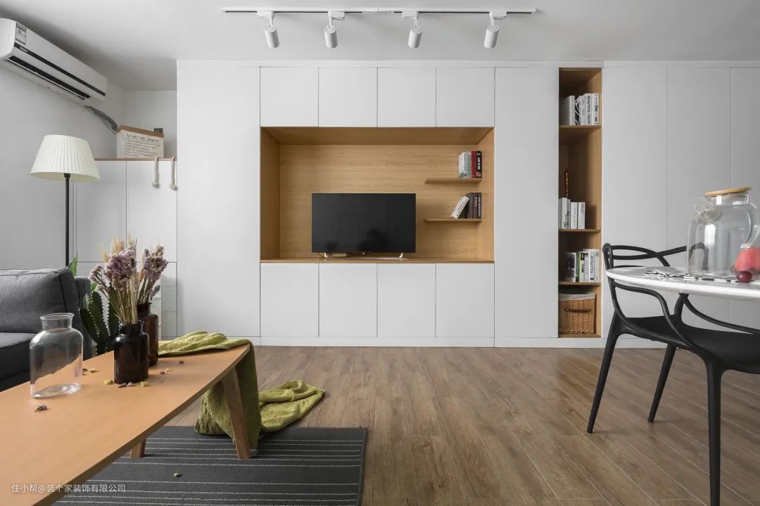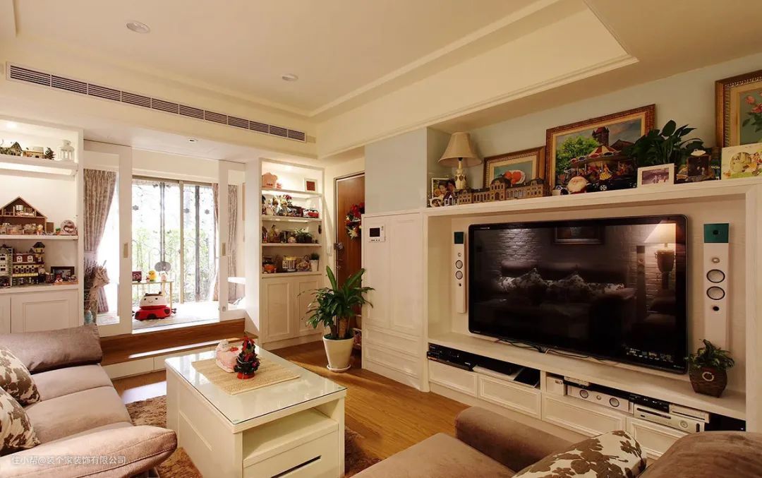 现在也有很多业主为了增加收纳,会将电视墙做成整排的柜子。事实上,这种整墙柜子的设计更加适合有足够空间的大户型使用,如果您家是小户型的话,打上一排柜子之后,客厅就会看上去特别拥挤。
